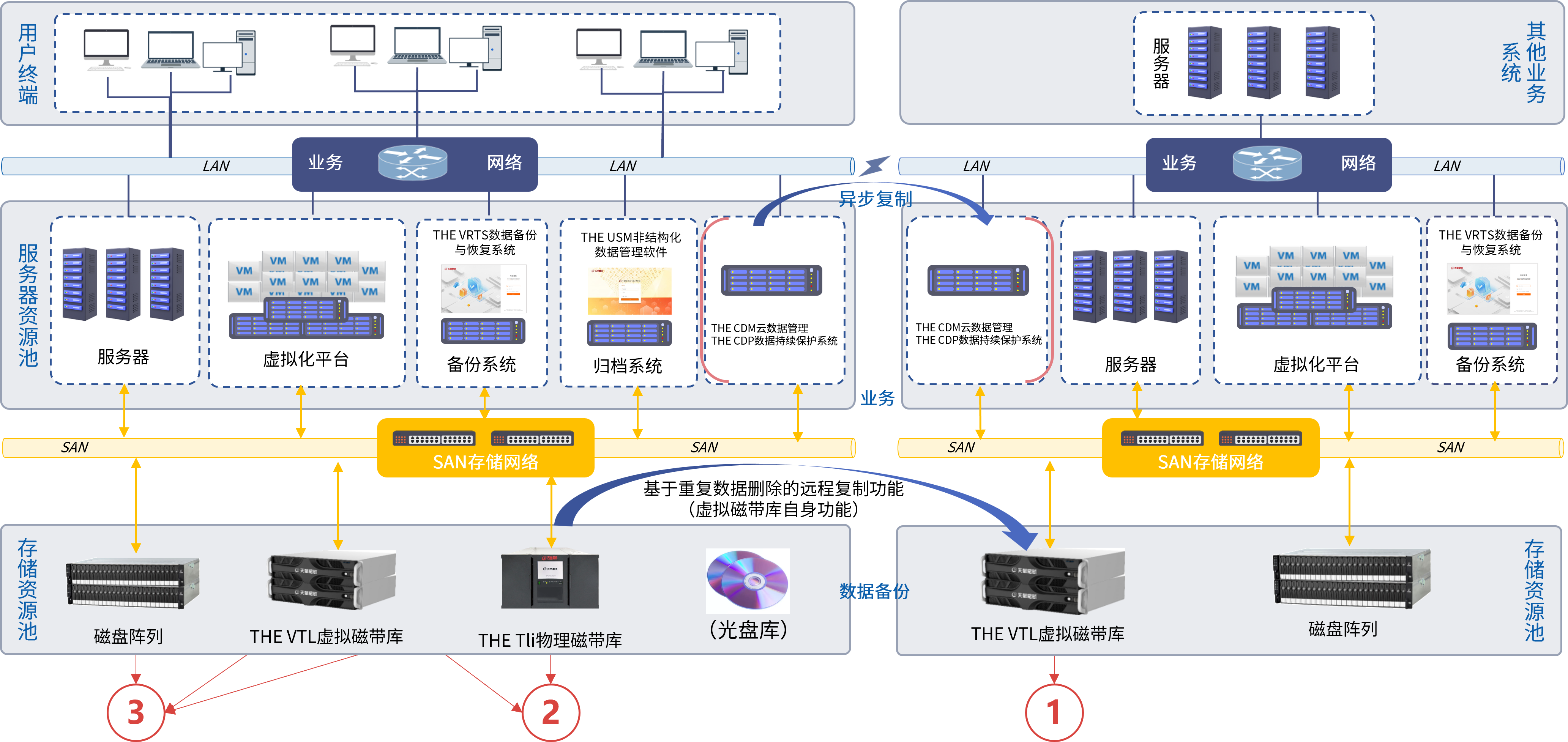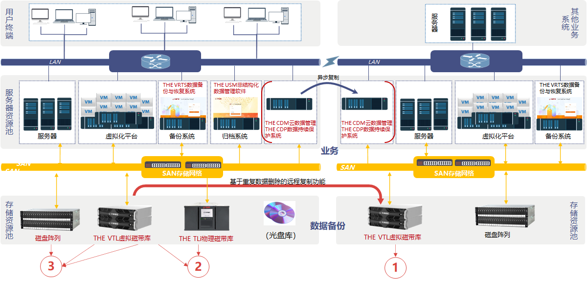 依据“3,2,1,0”黄金备份法则,采用安全、稳定的“D2D2T”架构,为用户构建一套完整的备份数据近线存放、数据自动化离线归档和异地灾备的数据备份与恢复解决方案;确保用户的数据资产得到全面保护。